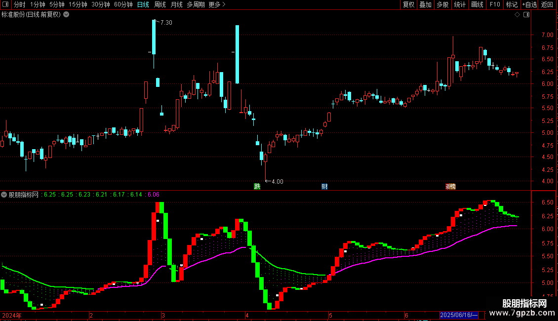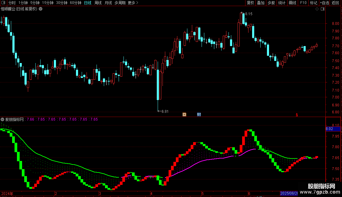 它通过计算七组不同周期的指数移动平均线,并对其未来值进行预测,形成多条趋势线。当预测线上涨时,以洋红色点状线显示;下跌时,以绿色点状线显示。其中最长周期的VAR7线加粗显示,使其更醒目。