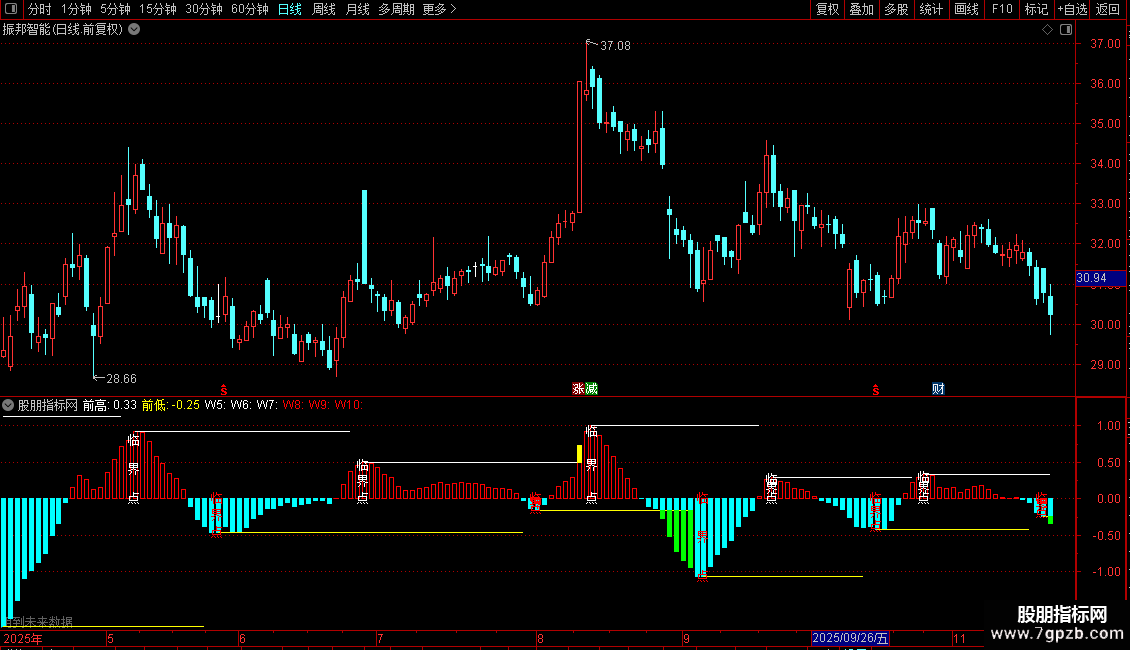 观察MACD柱状线与“前高”、“前低”趋势线的相对位置。当红色柱体突破白色“前高”线时,可能预示上涨动能增强;当青色柱体跌破黄色“前低”线时,可能预示下跌动能加强。同时关注“临”、“界”、“点”的文字提示位置,它们标识了潜在的阻力或支撑临界区域。