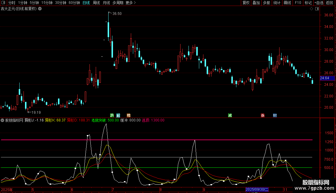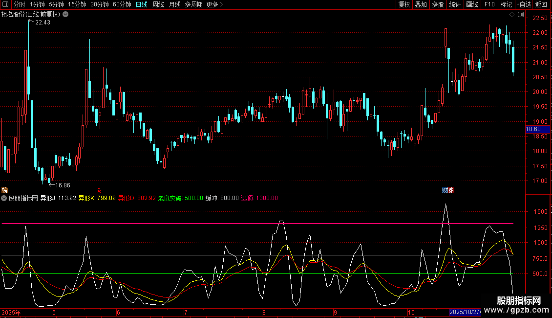 指标结合了筹码分布、KDJ及价格区间,通过异形J、K、D三条线进行动态分析。异形J线为核心波动线,异形K线为短期趋势线,异形D线为长期趋势线。老鼠突破、缓冲、逃顶为三条水平参考线,用于识别关键突破位与风险区域。指标旨在捕捉价格在筹码与动能共同作用下的趋势转折点。