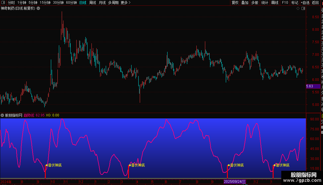 买入时机:当副图出现红色柱线并显示“★潜伏神底”字样,或者选股公式发出信号时,代表股价处于低位且趋势开始反转,适合激进者潜伏或稳健者观察。