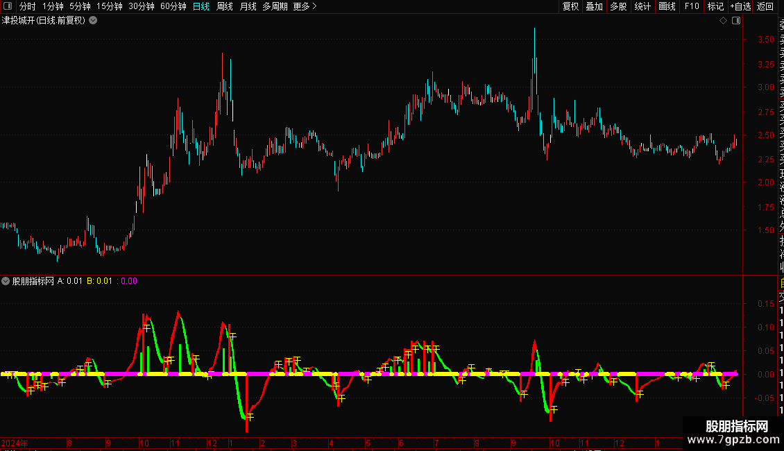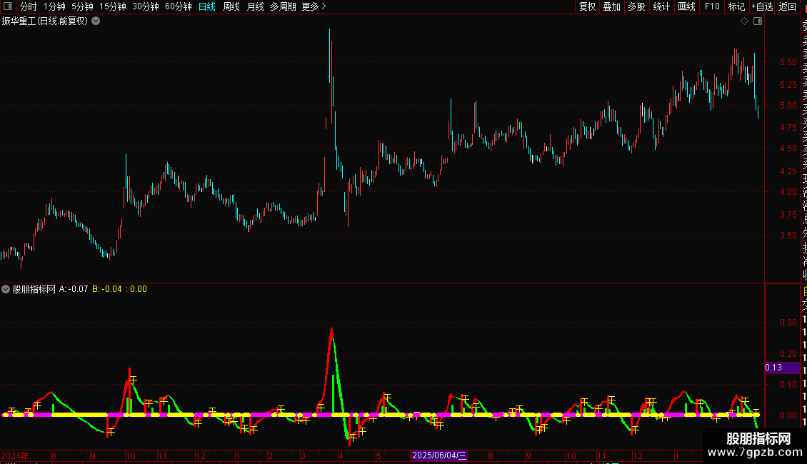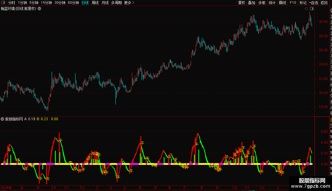 指标通过两条不同周期的指数均线差值构建动能带,直观展示多空力量变化。红色区域代表多头强势,绿色区域代表空头主导。操作策略上,当动能线由弱转强并出现“干”字信号时,视为买入时机;反之,当动能线由强转弱时,则为卖出或减仓信号。粗线条颜色变化辅助判断趋势延续性,紫色代表上涨加速,青色代表下跌加速。