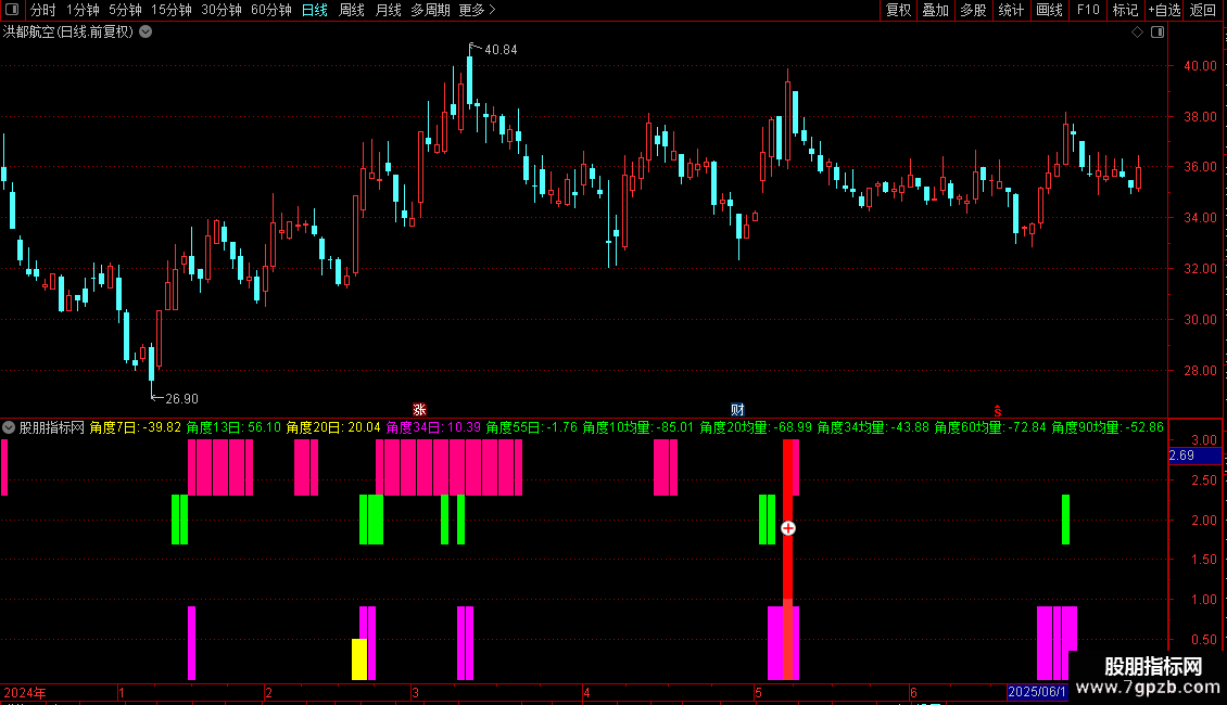 角度34日均量:=ATAN((V34/REF(V34,2)-1)*100)*180/3.1416 ;