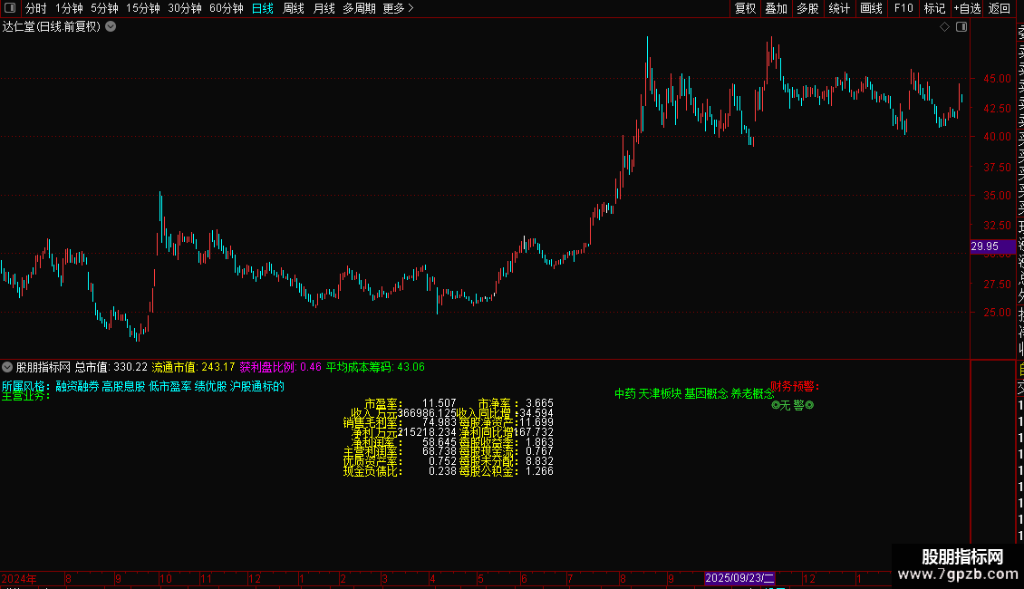 指标是一个全面的基本面信息面板,直接在K线图上展示个股的所属板块、主营业务、市值规模及获利盘比例。核心功能是进行财务健康度诊断,通过计算Z值模型自动预警财务风险(重警、轻警或无警)。同时,它详细列出了市盈率、毛利率、净利润增长率、每股现金流等关键估值与成长指标。操作策略上,投资者可利用此面板快速筛选低估值、高成长且财务安全的标的,避开有财务预警的风险股,辅助价值投资决策。