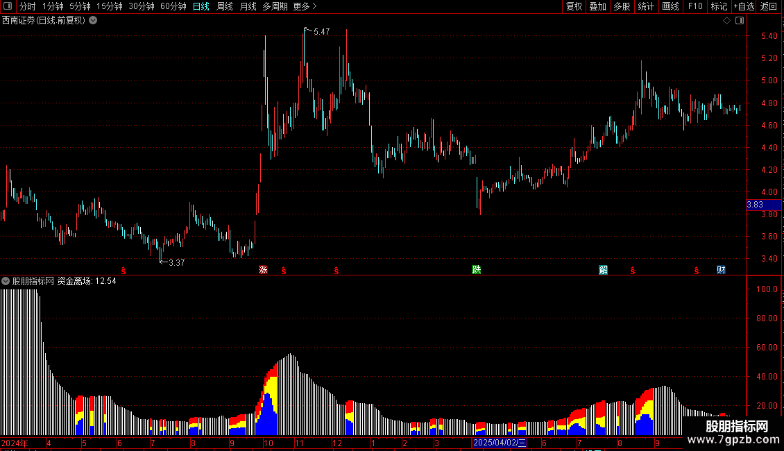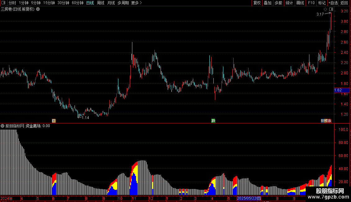 指标在副图区域显示彩色柱状图。出现三色柱时,表示长、中、短线资金同步流入,是看多信号。当柱状图消失或出现“资金离场”标识时,表明资金流入状态被破坏,需警惕趋势变化。