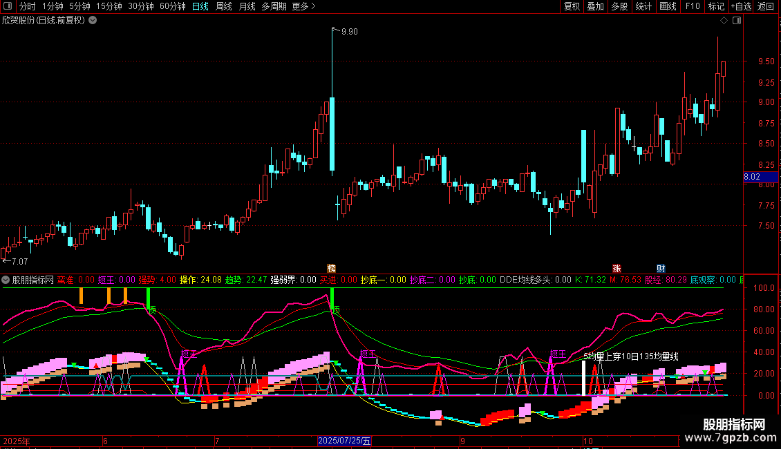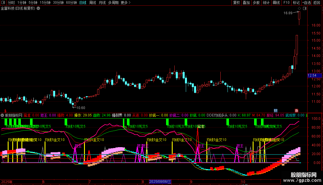 5. 强势状态标识:当均线多头、领涨大盘且趋势向上时,用特殊柱状线标记“强势”状态。