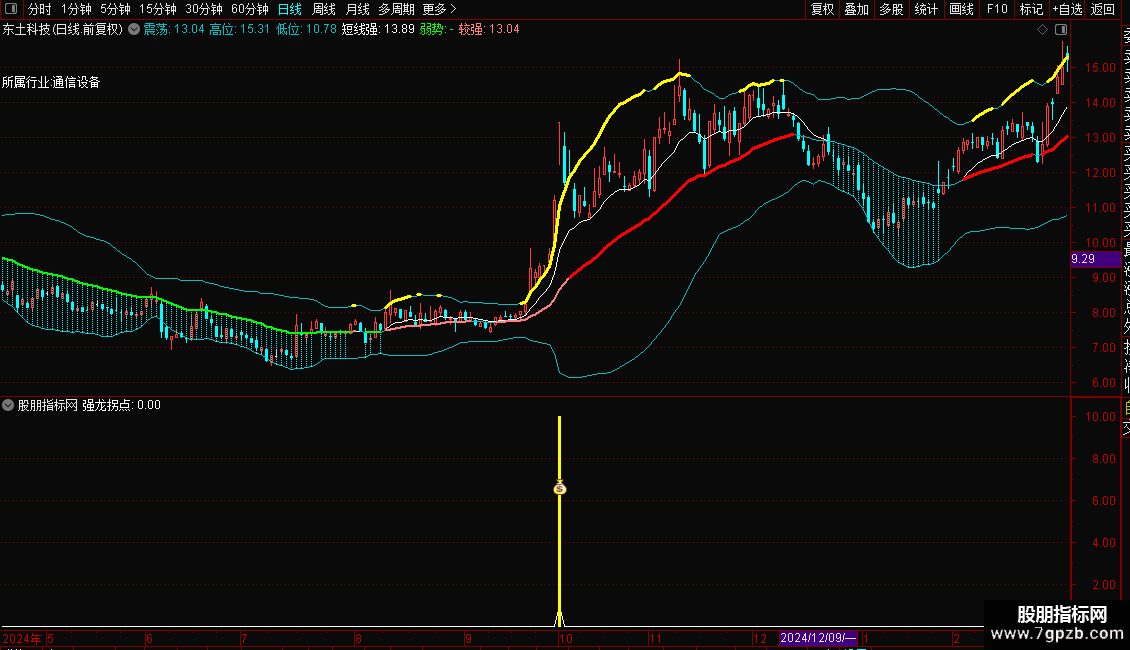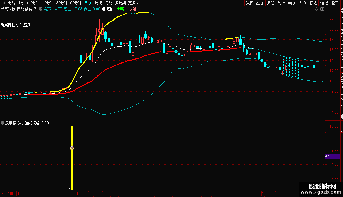 信号介入: 当副图出现黄色柱状线或图标(强龙拐点)时,代表系统捕捉到了“连阳+涨停”的爆发形态。这通常被视为短线加速的信号,可结合成交量变化考虑跟进。