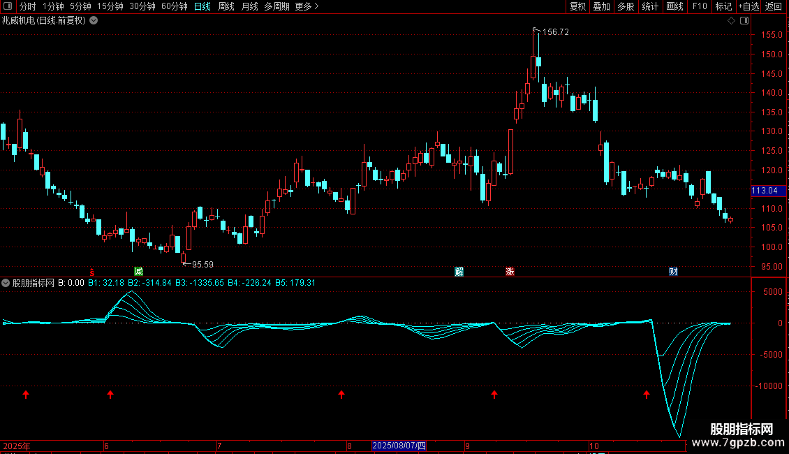 指标包含能量线B1至B5,以及基于能量线形态和强度的筛选条件。信号以图标形式在副图显示。