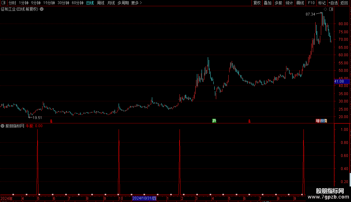 牛股:COUNT(AA,30)=30 AND V1>REF(V1,1)COLORRED;