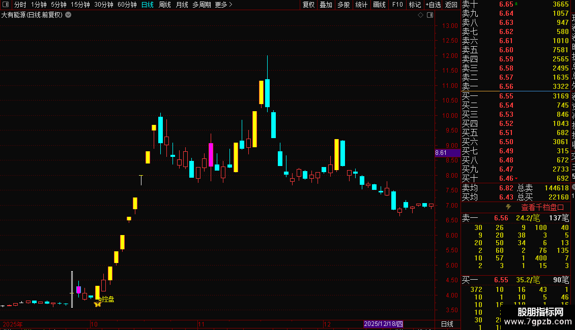 指标主要功能是识别主力控盘程度和捕捉超跌反弹机会。它通过统计特定形态的出现次数,判断股价是否经过充分洗盘,并在股价放量突破关键压力位时发出“控盘”信号,提示主升浪可能开启。同时,当股价在低位连续出现特定止跌形态且跌幅过大时,会标注“抄底”提示,博取短线反弹。操作策略上,见到“控盘”字样可顺势跟进做多,出现“抄底”字样可轻仓试错博反弹,需结合成交量确认。