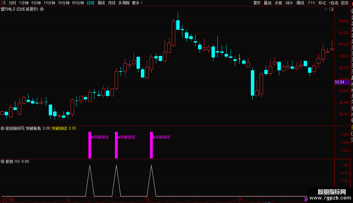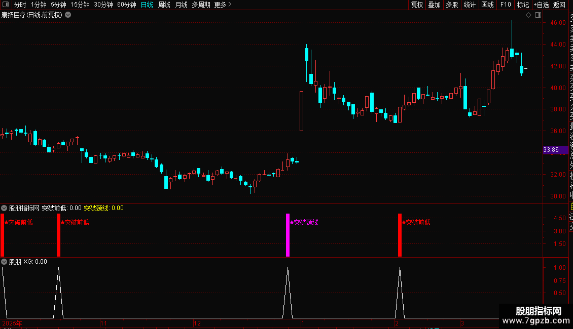 指标专门用于捕捉“黄金坑”形态后的突破买点。其核心逻辑是寻找股价在短期内急跌挖坑,随后企稳并重新站上关键压力位的走势。主要功能识别两种强势信号:一是股价放量突破前期低点形成的坑底压力,确认洗盘结束;二是股价突破颈线位,确立双底或头肩底形态完成。操作策略上,当副图出现红色柱体及“突破前低”文字时,可视为激进建仓点;出现紫色柱体及“突破颈线”文字时,为趋势确认的稳健加仓点,适合短线博弈主升浪。