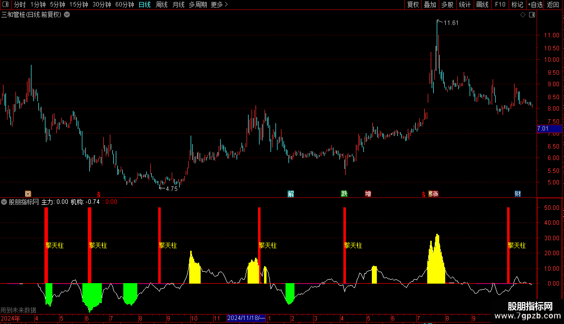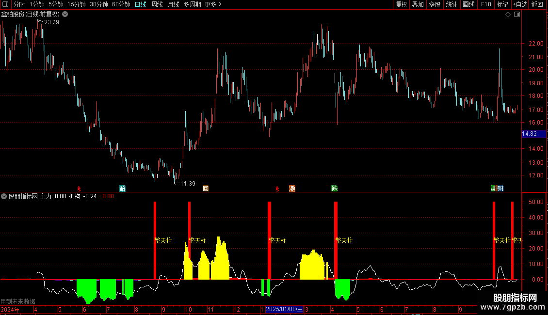 机构线:围绕零轴波动。当其为较大正值(黄色柱)时,表示股价强势,机构可能做多;当其为较大负值(绿色柱)时,表示股价弱势,机构可能做空或观望。