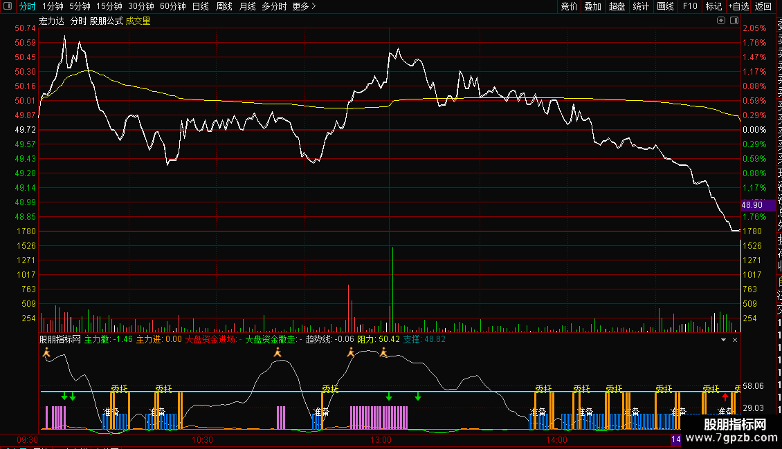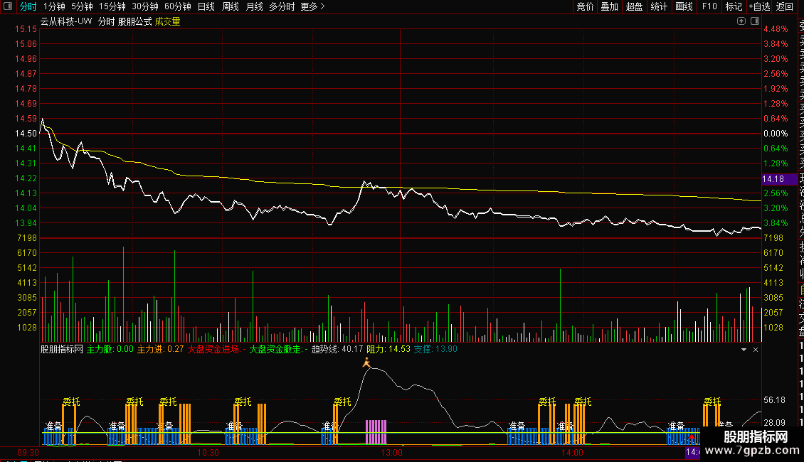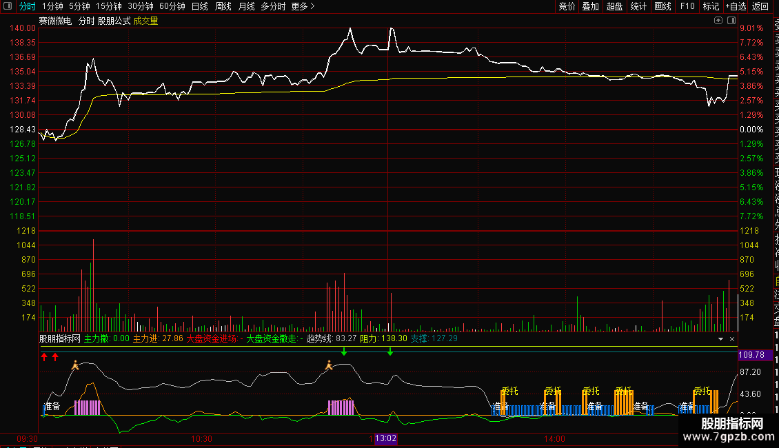 加载至副图。观察“主力进/撤”与“大盘资金”柱状图的颜色与高度,判断资金合力方向。结合“趋势线”的数值、拐点以及“准备”、“委托”、“见顶清仓”等文字和图标信号,辅助判断个股的阶段性买卖时机。同时可参考指标自动计算的支撑位与阻力位。
