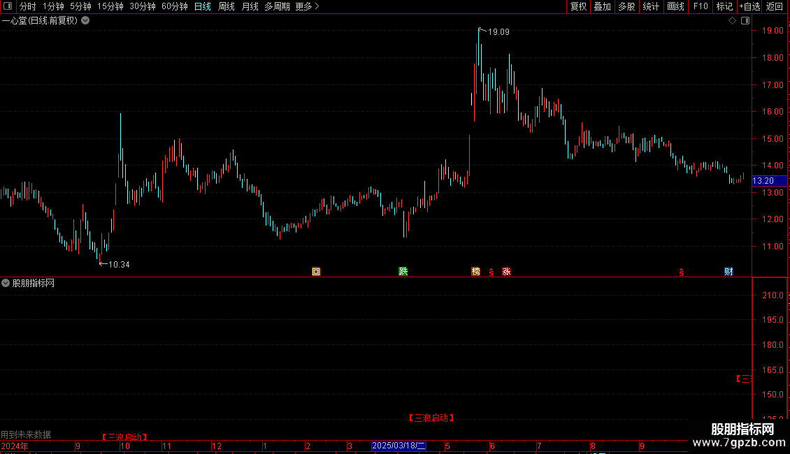 4. 当同时满足“20%周期出现底部转折”(`EN3`)和“上涨初期仅得到一次小周期确认”(`ZTJZ10=1`)时,在图表对应K线的低价位标注“【三浪启动】”文字提示。