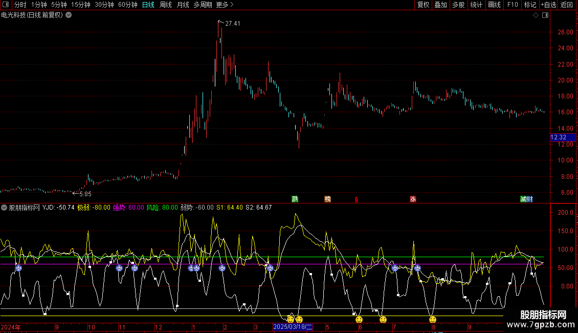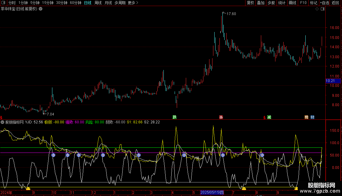 指标包含两个核心部分:YJD和S系列线,用于判断超买超卖和资金强弱。