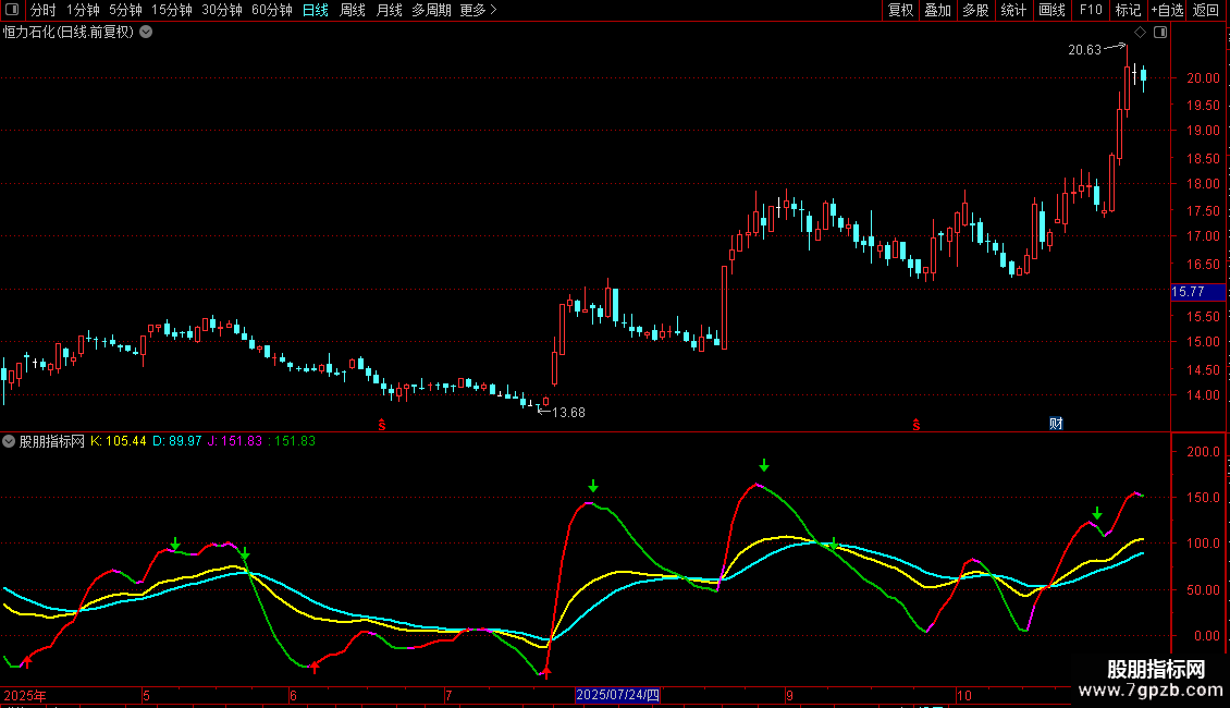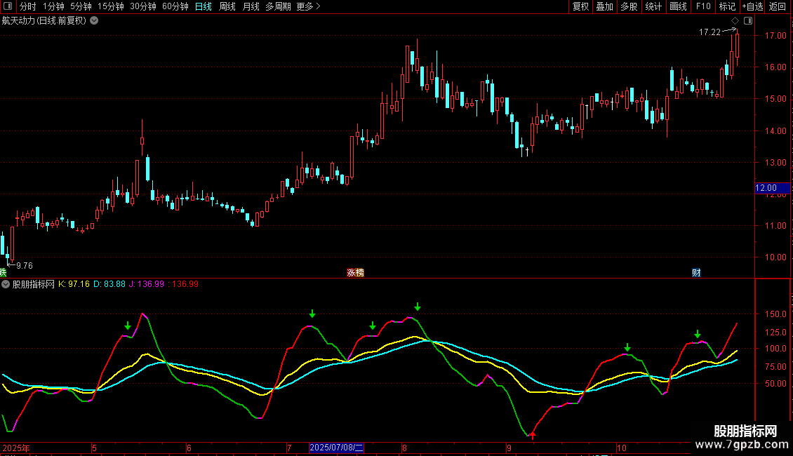 指标基于价格均值与标准差构建,通过计算K、D、J三条曲线分析价格偏离与动量变化。K线反映价格偏离均值的程度,D线为K线的平滑,J线为两者的差值。指标通过颜色区分J线涨跌,并在特定条件满足时显示买入或卖出图标。