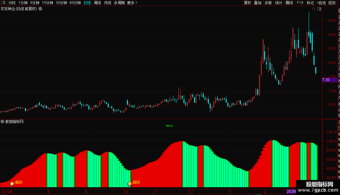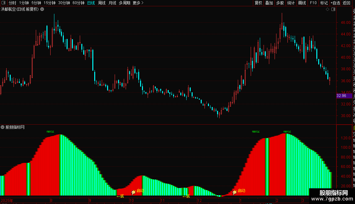 指标是一个综合性的趋势与买卖点提示系统。主要功能是通过多重均线、波动率及资金流向算法,判断股价所处的相对高低位及趋势强弱。操作策略上,当出现彩色柱状体由绿转红或数值上升时,代表多头动能增强,可视为持股或买入信号;当柱状体转绿或数值下降,提示风险增加应考虑减仓。此外,指标会在超跌区域提示“底”部机会,在均线金叉且处于低位时提示“启动”信号,辅助投资者捕捉趋势反转点。