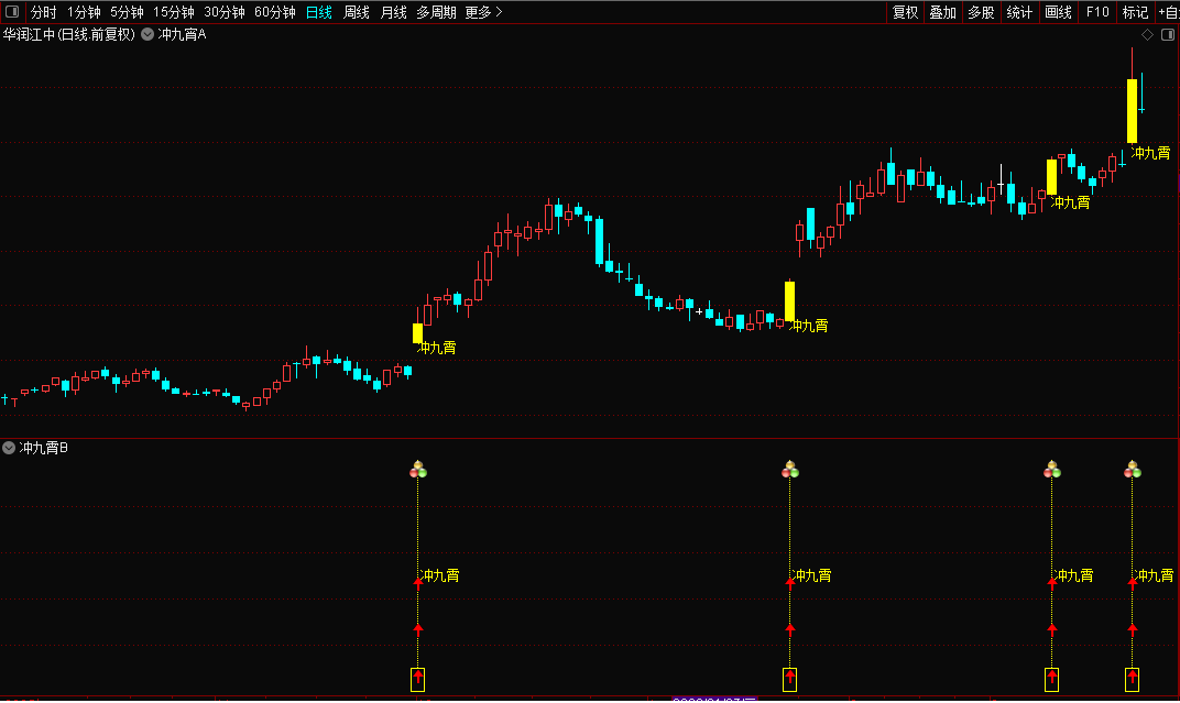 主图公式黄色柱状线及"冲九霄"文字信号。