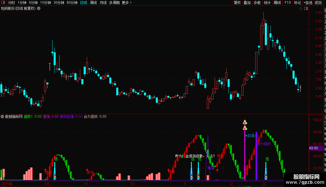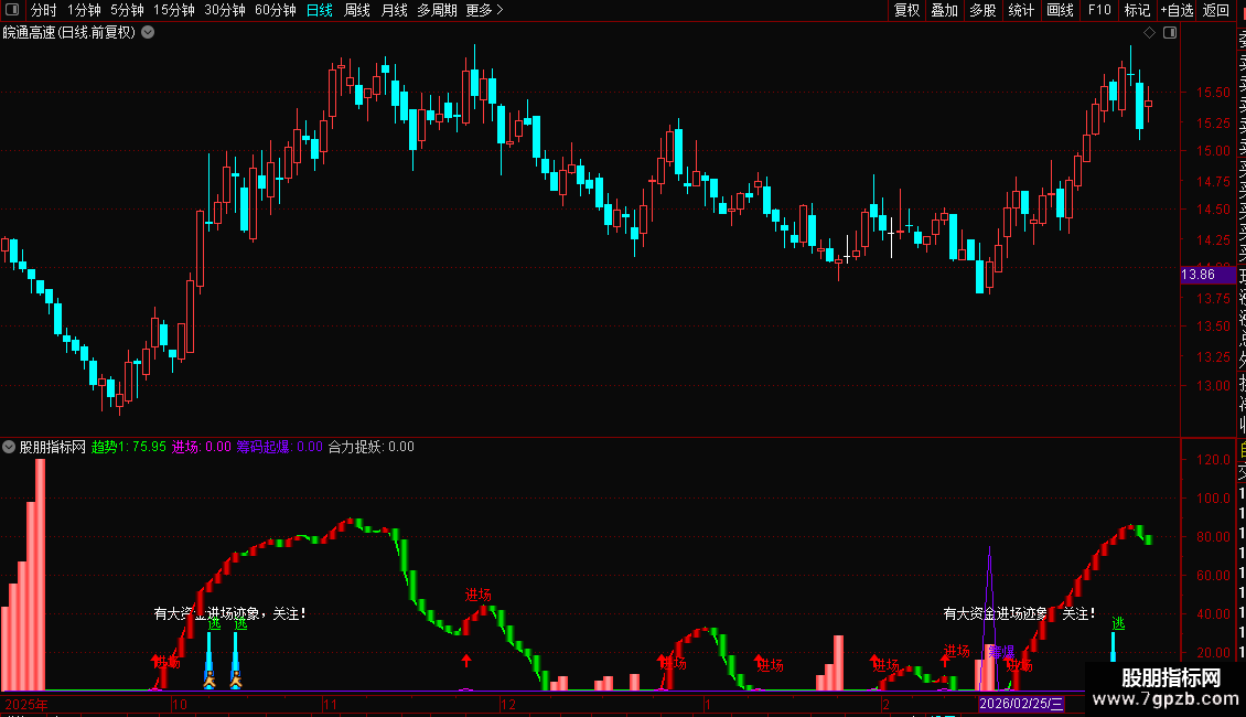 2. 进场时机:指标显示“进场”红色文字+向上箭头,且“趋势1”由绿转红时,为潜伏良机;“有大资金进场迹象”提示资金异动,需跟踪量能是否持续放大。