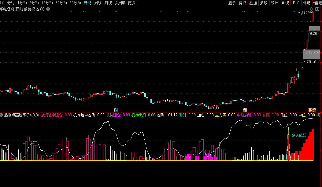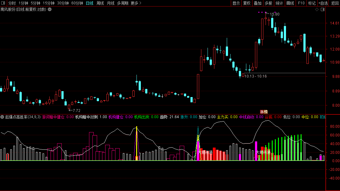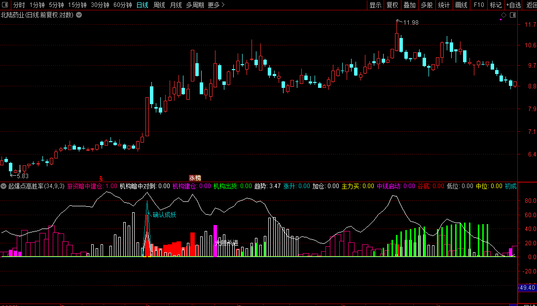 副图中出现洋红色柱状线且上方标注“大胆杀进”文字时,代表该股票触发买入信号。此时应重点关注,信号出现当日股价涨幅超过8.5%,且处于强势状态转换节点,通常是主力洗盘结束重新拉升的标志。操作上可在收盘前确认信号有效后轻仓介入,或次日开盘后观察成交量是否持续放大再决定是否跟进。该信号出现频率较低,选出的股票往往具备较强的短线攻击性,建议结合当日是否涨停、板块热点以及大盘环境综合判断,不宜单独作为唯一买入依据。持股周期一般为短线,若后续股价跌破信号当日最低价应考虑止损。经测副图手机不能使用选股公式手机可以使用。