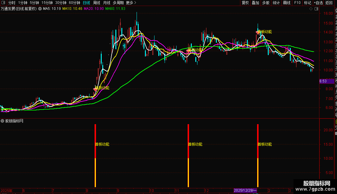 指标的主要功能是识别股票在经历一次显著的大阳线涨停板后,次日可能出现的强势回调或继续上涨的“首板动能”机会。其操作策略基于一个核心判断:寻找前一天收盘价等于当天最高价(即光头大阳线)且涨幅超过阈值的股票,同时要求当日的预测成交量在一个特定范围内(既不过于清淡也不过度放量)。当这些条件满足时,系统会在当天进行标记,提示投资者关注该股票第二天的表现,因为这可能预示着主力资金的介入和后续的上涨潜力。