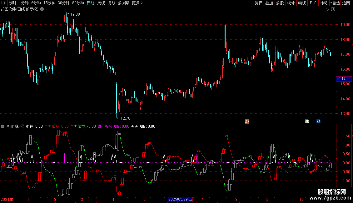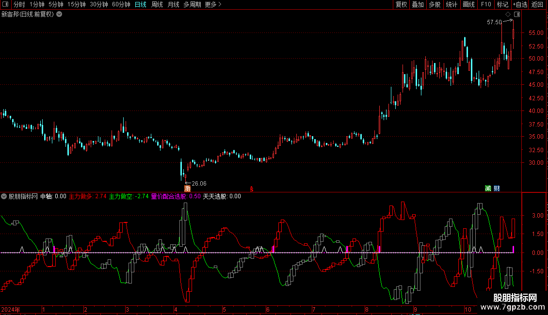 副图区域会显示“量价配合选股”和“天天选股”两个信号点。当出现彩色柱或信号点时,表示对应的选股条件被触发。