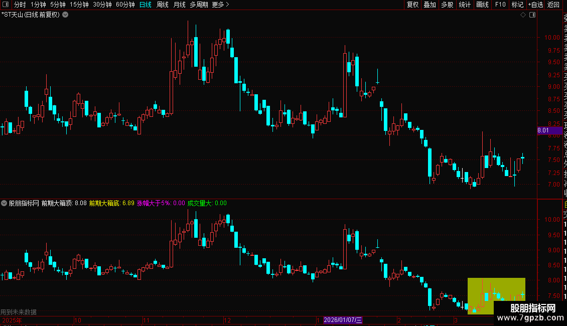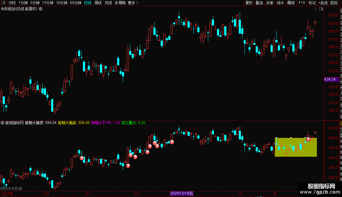 1. 绘制箱体:自动识别近期的高低点,形成一个箱体区间,并用色带标注。