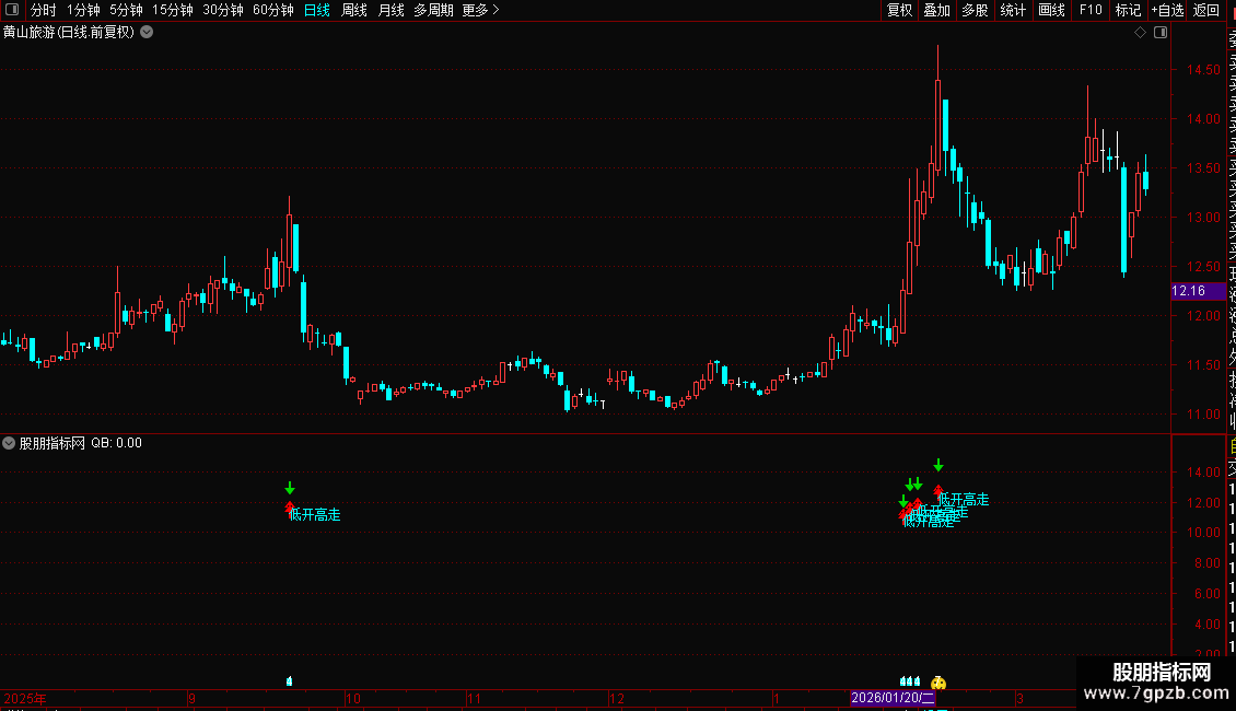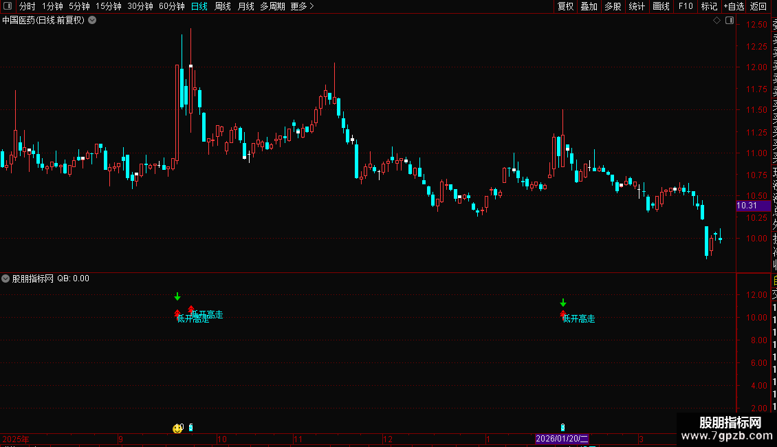 DRAWTEXT(QB AND 低开高走信号,L*0.90,'双信号'),COLORRED;