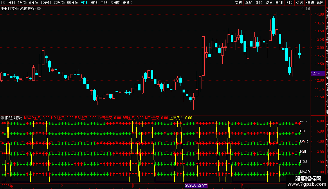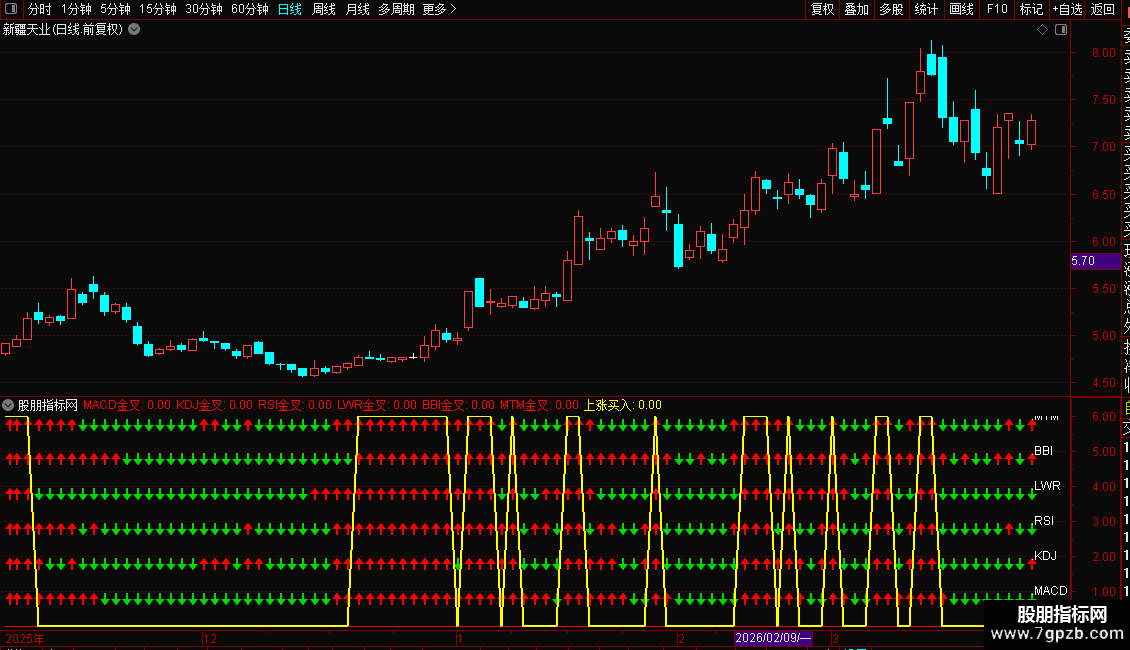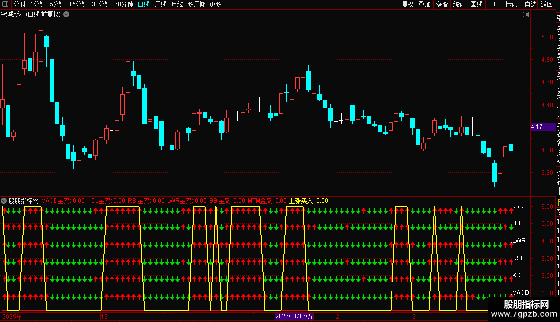 指标整合了MACD、KDJ、RSI、LWR、BBI和MTM六个常用技术指标,并对其金叉信号进行可视化。