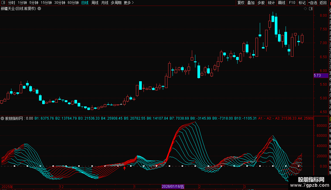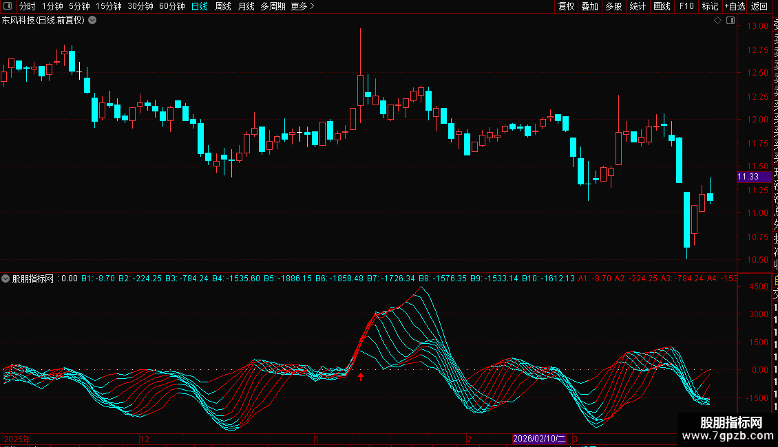 2. 量能攻击方向(A1-A10):当对应周期的量能线向上时,线条显示为红色,直观标示量能增强的周期。