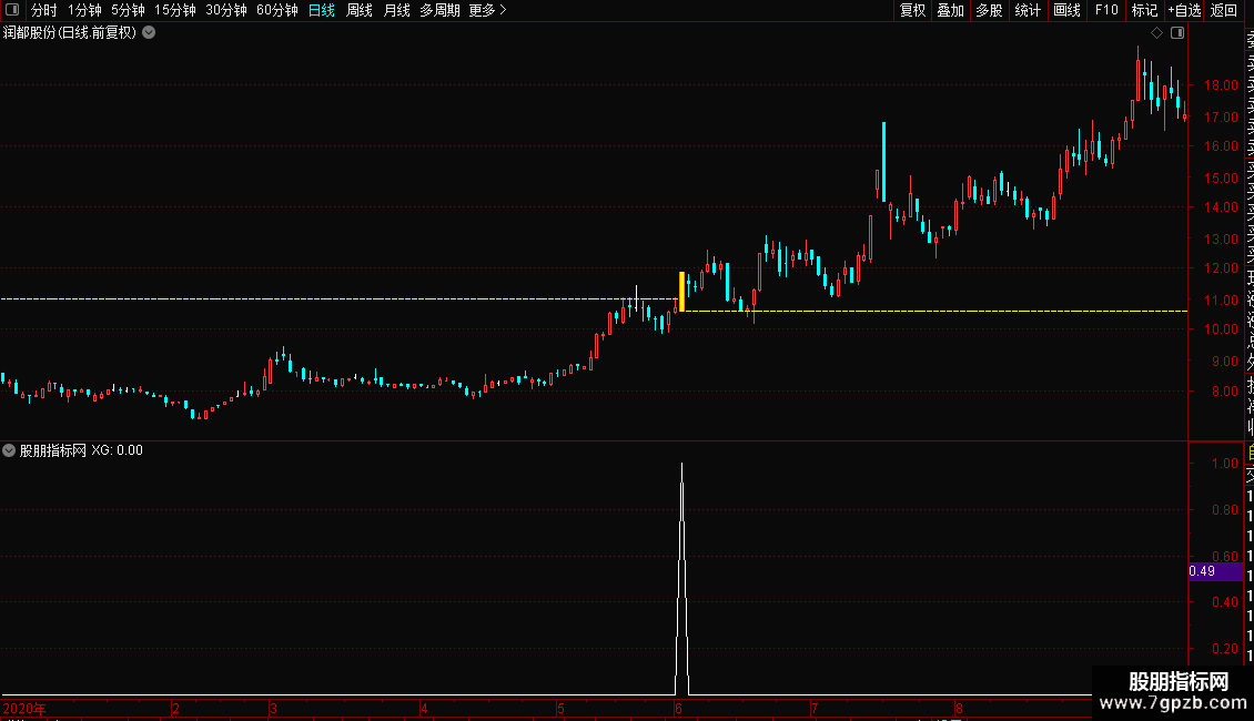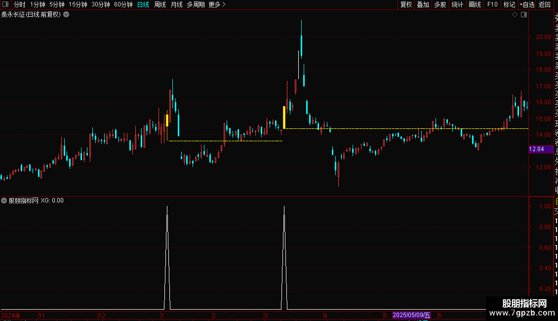 STICKLINE(XGDAY>0,REF(L,XGDAY),REF(L,XGDAY),3,0),COLORYELLOW;