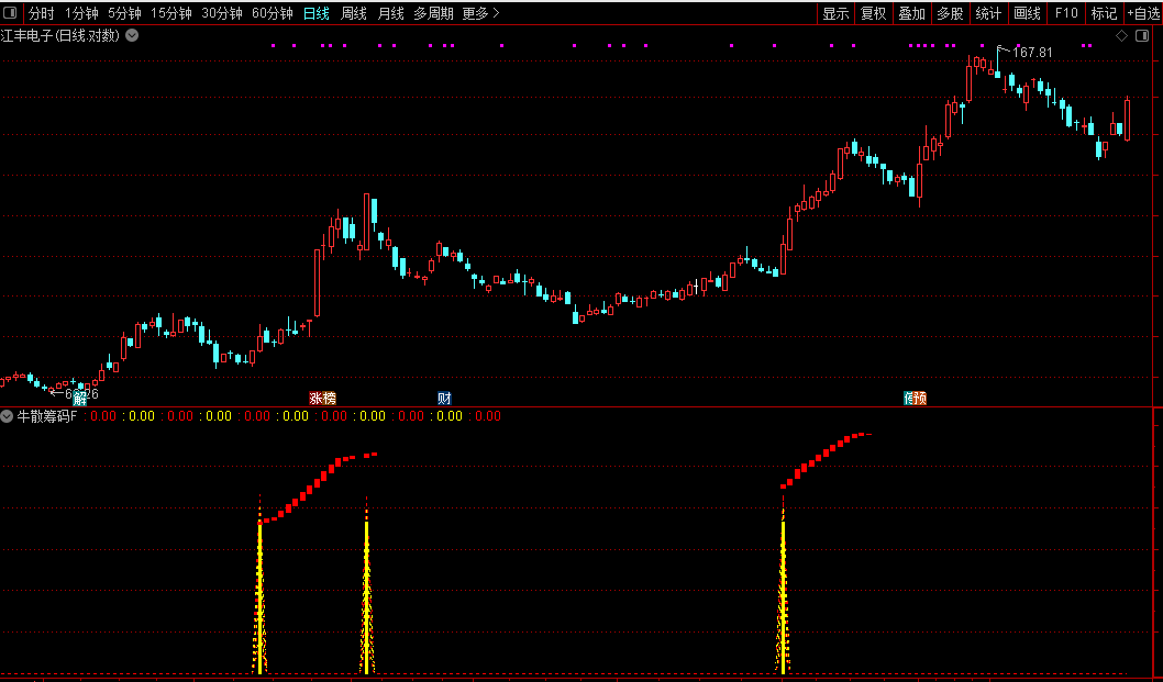 指标的核心在于一个特定信号:当中长期趋势指标与短期动能指标均转为强势,且中长期趋势指标刚刚上穿短期动能指标时,若当日股价收阳并伴随成交量放大,则定义为“牛散筹码”信号,并在副图中以醒目的柱状图进行标记。