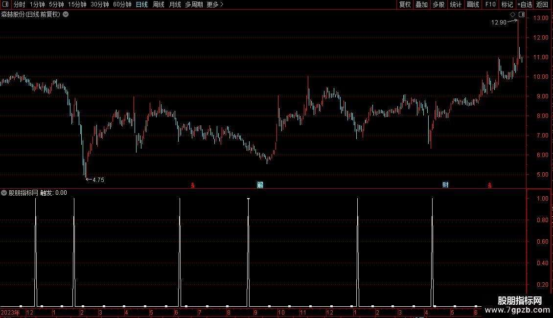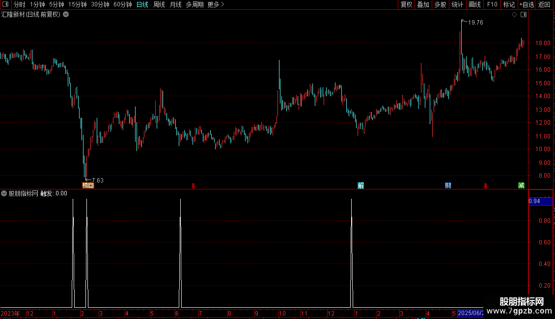 输出为“触发”信号,满足所有条件时标记为1。指标适用于趋势初期或回调后的再次启动阶段,常需结合其他分析手段综合判断。