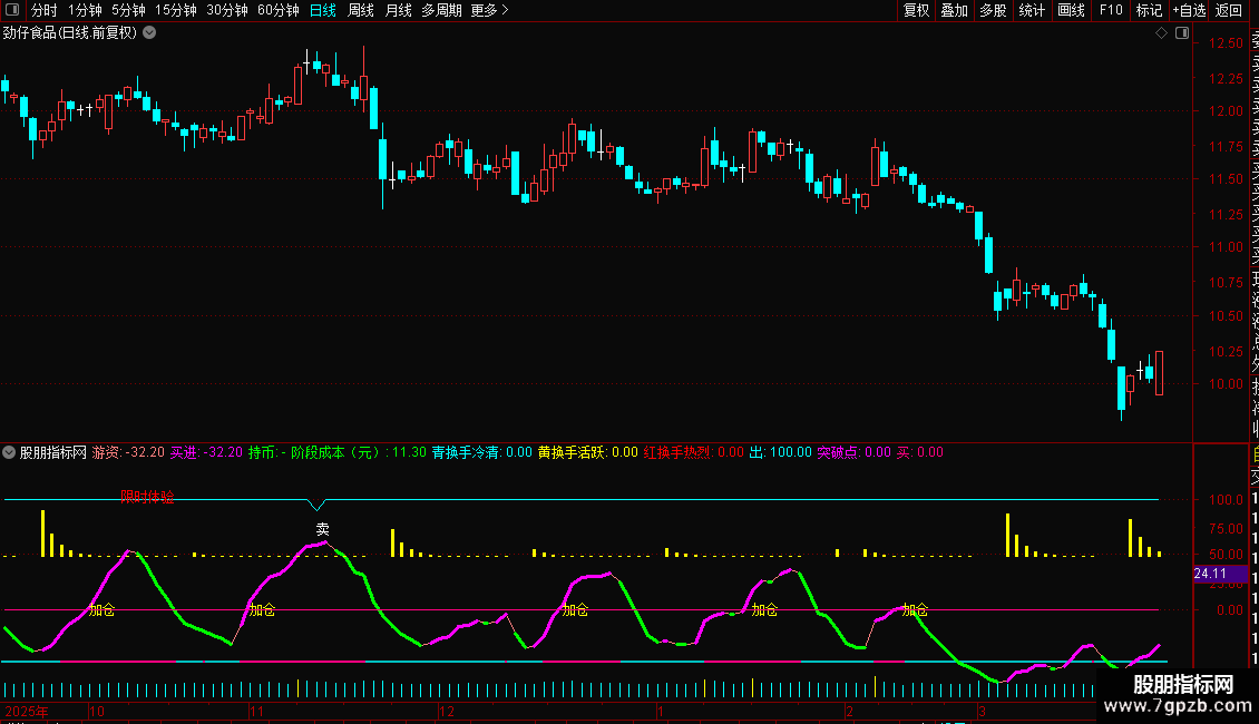 用法: 粉柱持股,蓝柱观望; 游资上扬(洋红粗线)买入,下穿(绿线)持币; “拐点”“加仓”“庄现!”提示关键机会,配合换手≥7%更有效; MM超80出“卖”字,警惕回调。