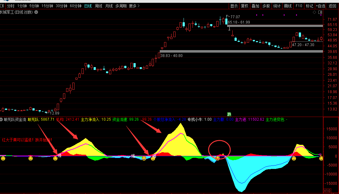 1、先出现红色机构资金(红色机构资金>黄色敢死队资金)