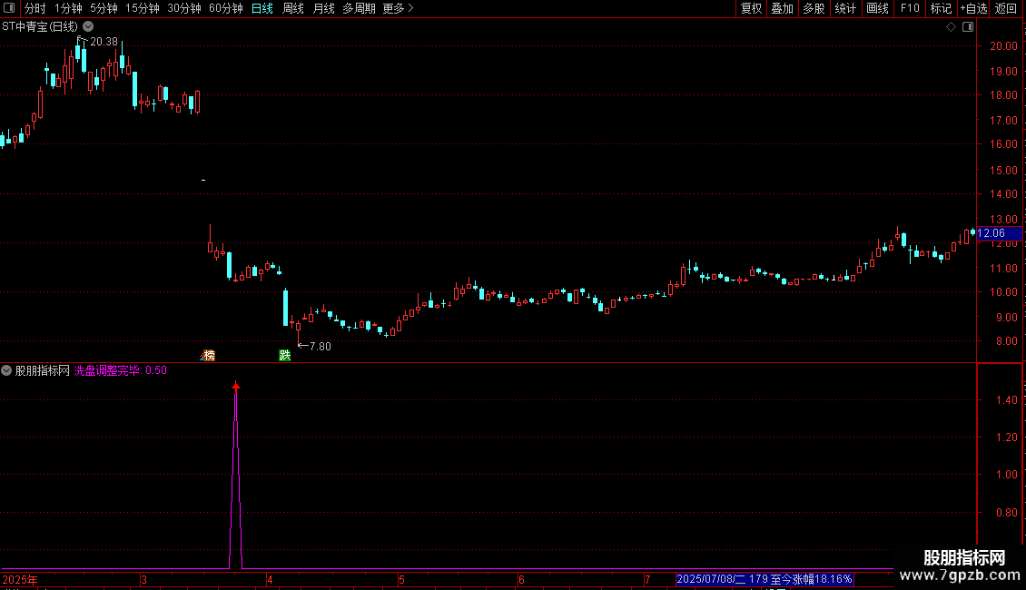 输出 洗盘调整完毕:(VAR312<-6 AND VAR412<-6 AND "KDJ的J"<-6)+0.5,COLORFF00FF