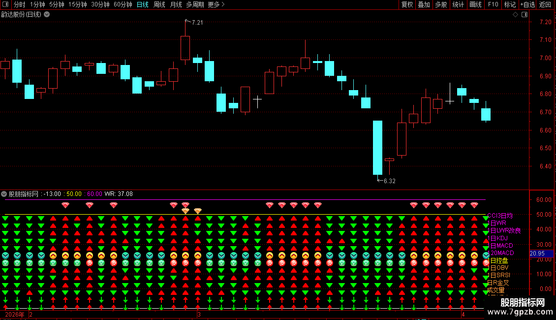 基础共振层:实时监测日线级CCI3日均、WR2日、MACD等6大指标趋势方向,通过箭头图标直观呈现多空状态;
