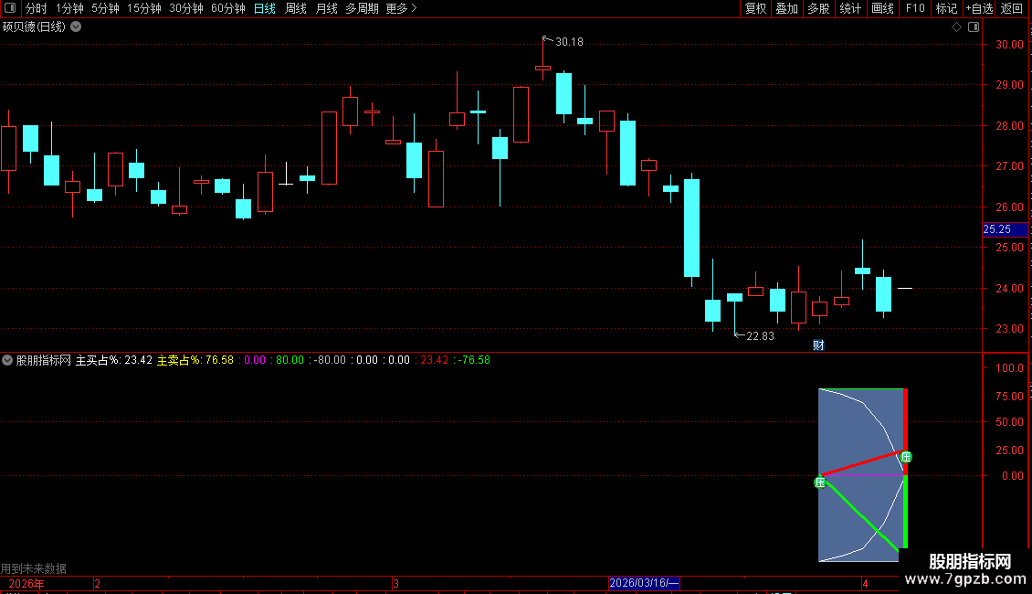 当满足条件-主卖占%<0ANDCURRBARSCOUNT=1时,在-80和0位置之间画柱状线,宽度为0.5,0不为0则画空心柱.,COLOR00FF00