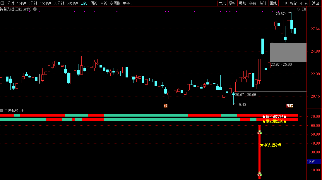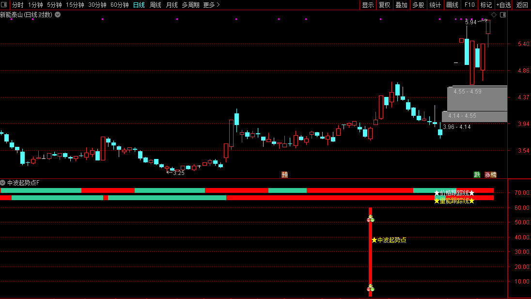 当同时满足以下五个条件时,系统发出“中波起势点”买入信号: