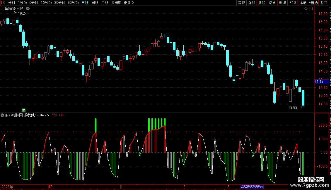 一条白色的“趋势线”与“阶段底部”线数值同步,用于观察其走势。