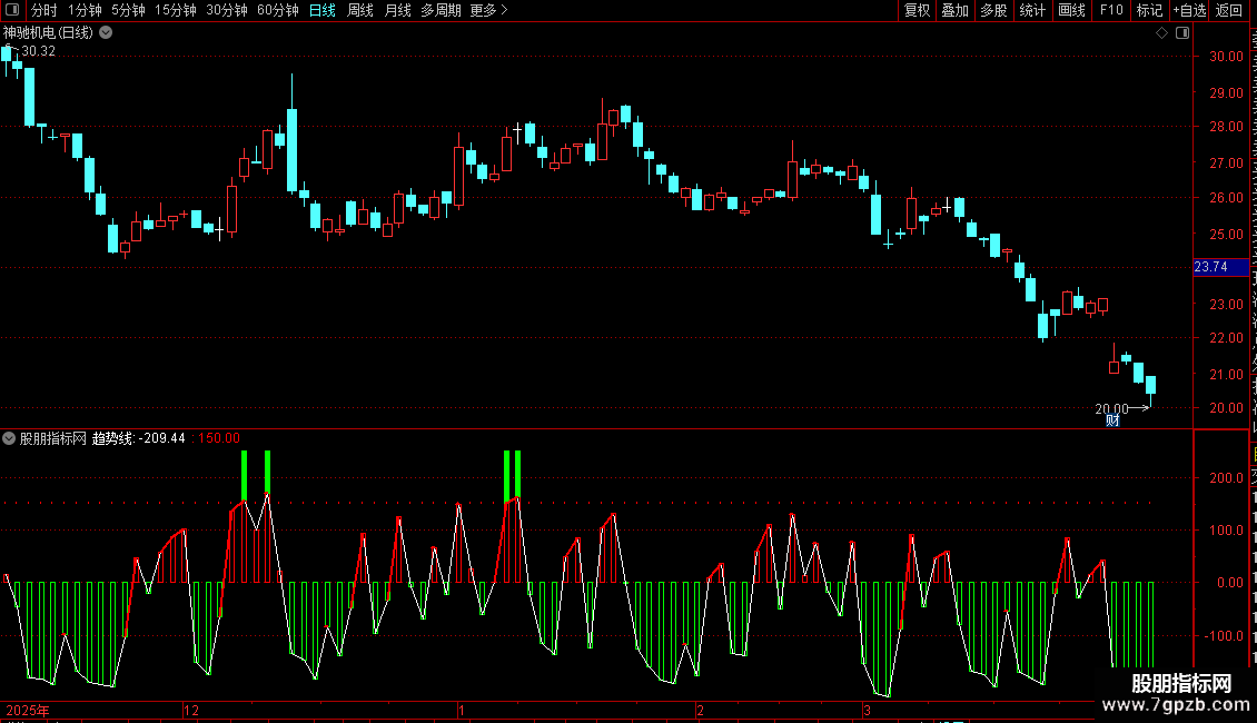 当“趋势线”数值超过150时,会触发一个绿色警示信号,提示可能进入超买或高风险区域。