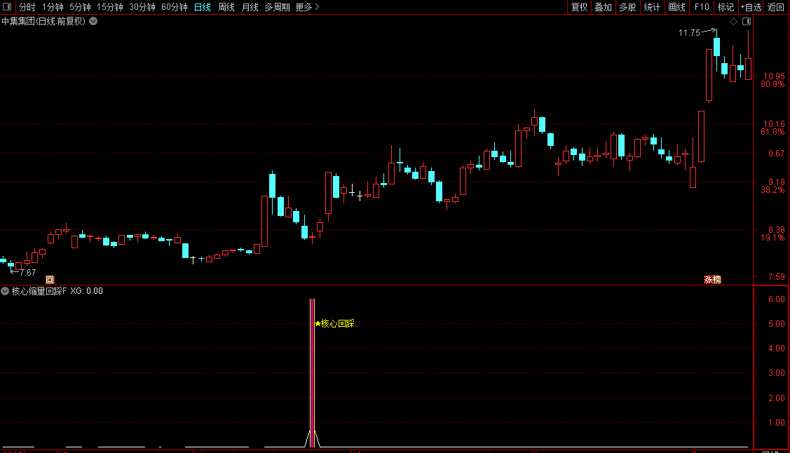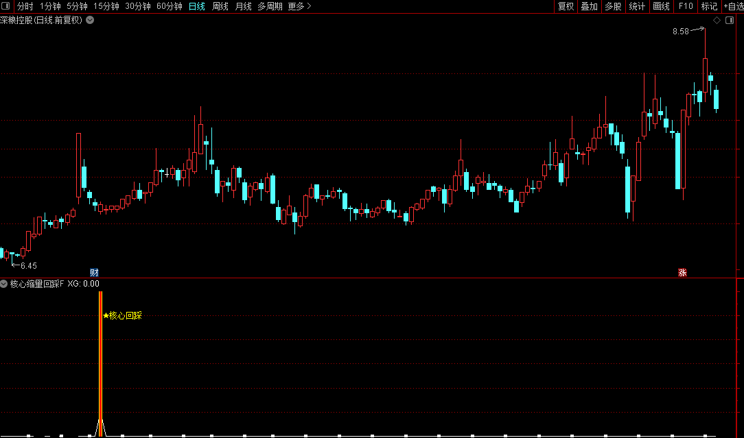 3,空间要够(深蹲到位):股价得"深蹲"一下,最好盘中探底到涨停板价的9折以下(≤0.92),这是为了制造恐慌,把最后一批胆小者洗出去。但收盘得收回来,留下长下影最好。