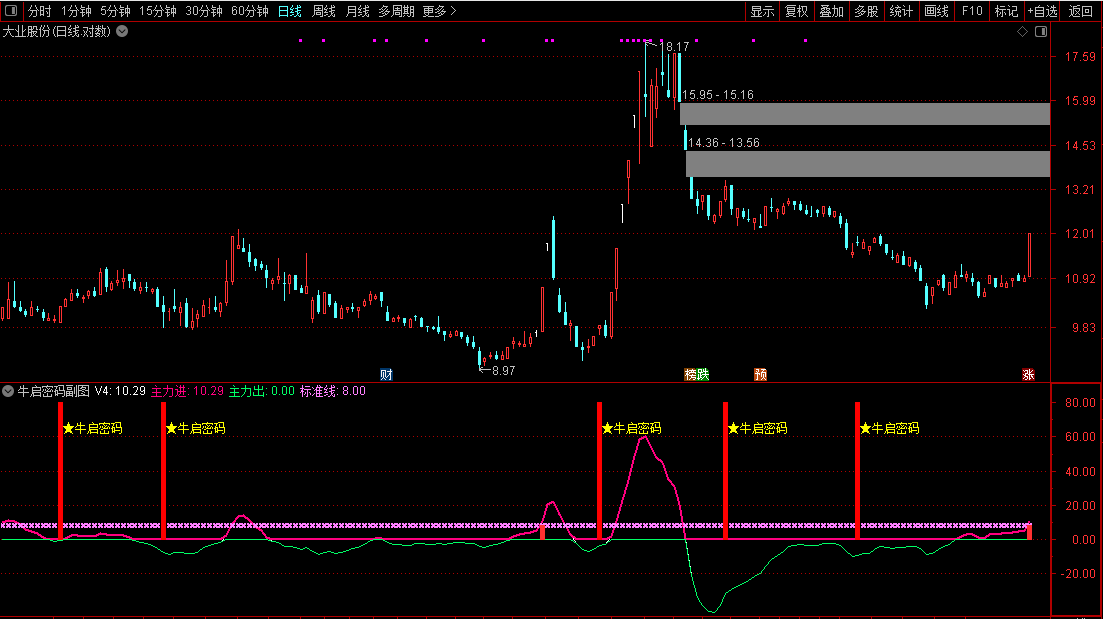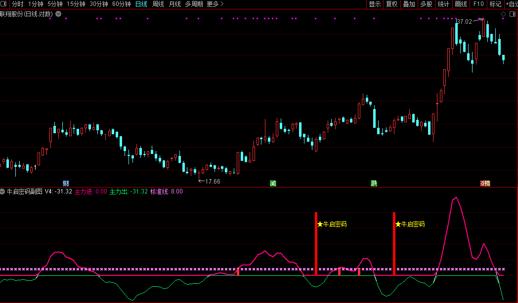 1. 副图指标:安装后加载至个股K线,**紫色主力进线**上穿粉色标准线、出现红色「★牛启密码」信号柱,为核心买入提示;绿色主力出线代表资金出逃,及时止盈止损。