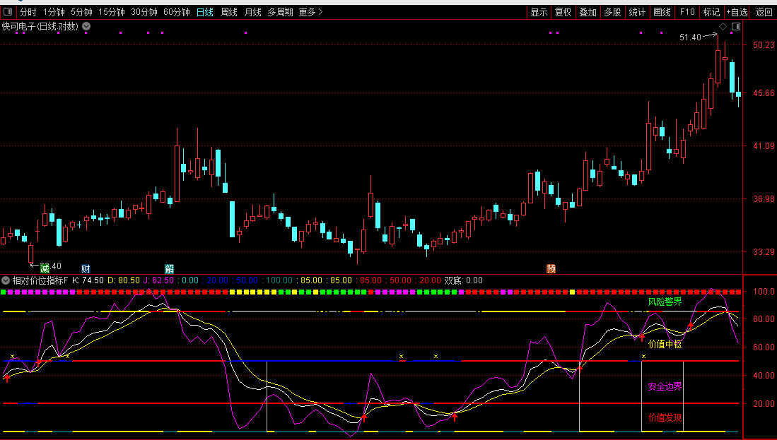 相对价位 J 值在低位(0~20)金叉,配合 OBV 红线、MTM 红线,胜率更高