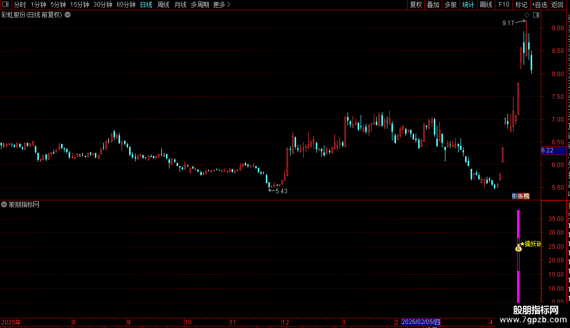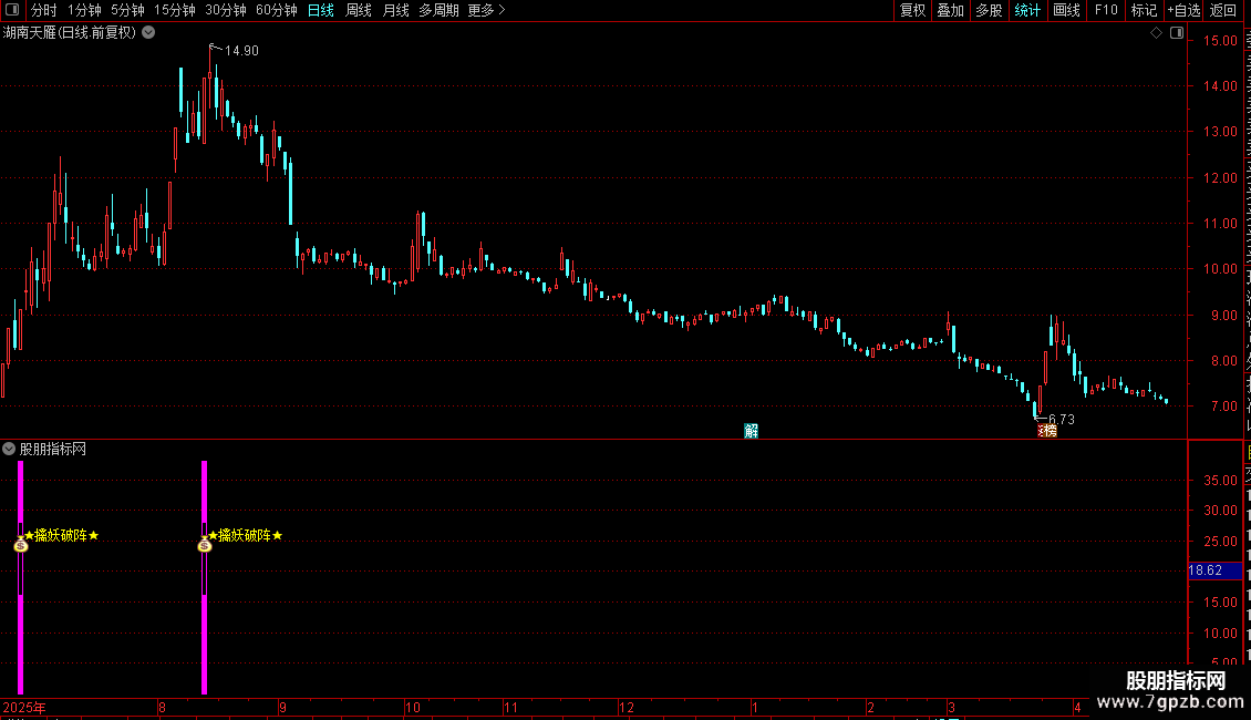 - 副图出现“★擒妖破阵★”文字及彩色柱时,表示满足条件。