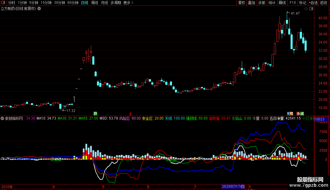 1. 均线系统:显示17日、10日、30日、55日均线,其中17日均线有变色处理,10日均线有涨跌柱状线。