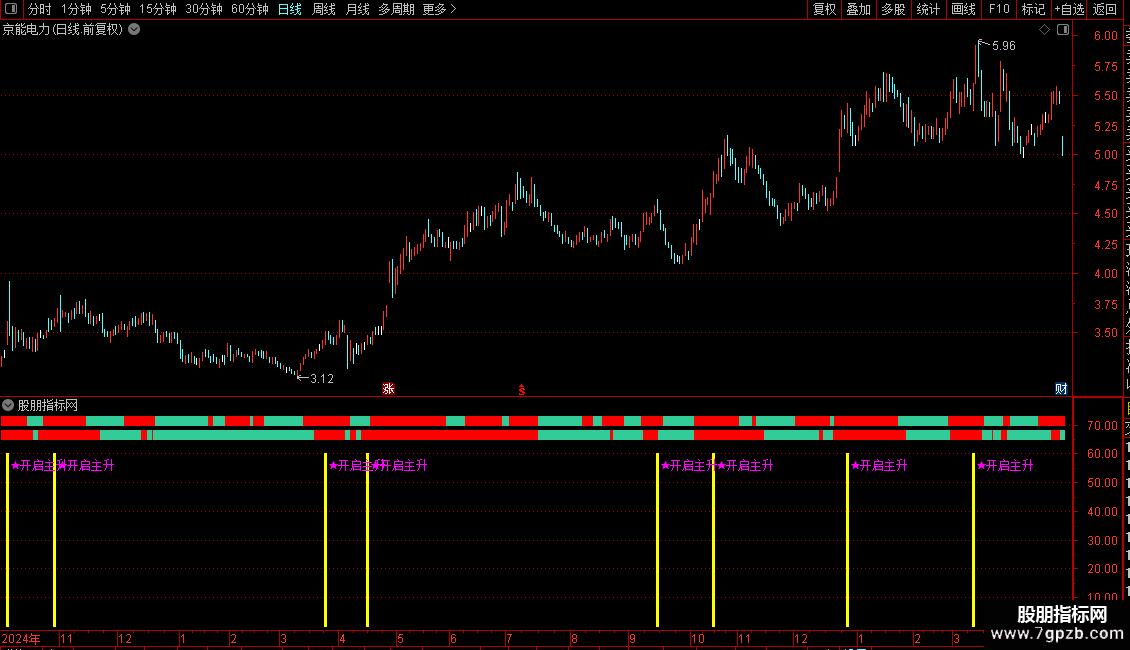 副图公式:通过多周期均线(3/13/34/144日均线)、量能强弱、牛马线趋势、中长期均线多头排列综合研判,出现 青色柱+★开启主升 信号,即为强势主升启动信号,同时用红绿柱直观展示趋势强弱。
