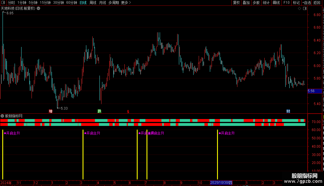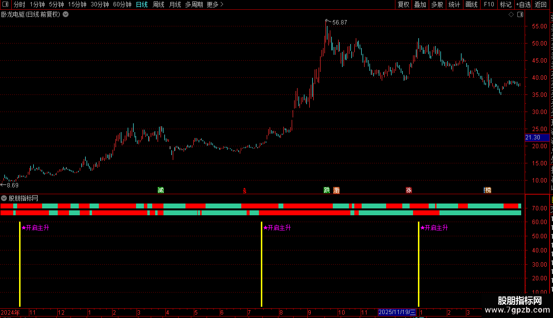 1. 副图使用:导入通达信副图公式,个股界面调出指标,看到 ★开启主升 信号+青色提示柱,叠加中长期均线多头,果断关注主升行情。