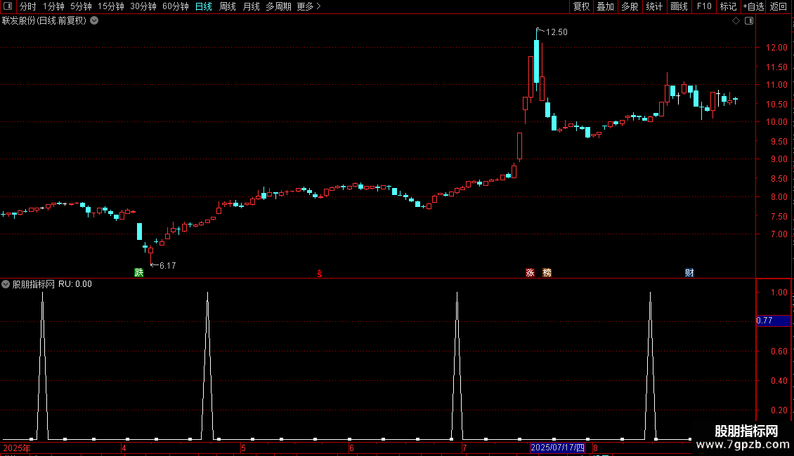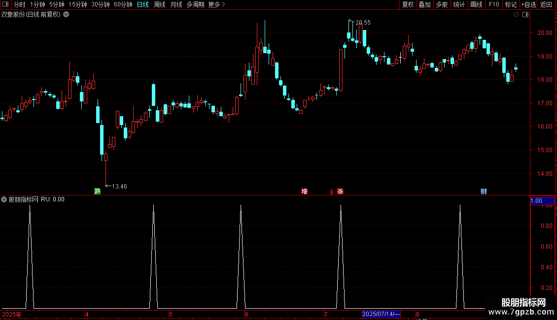 该公式计算一个加权移动平均线MM(基于价格加权值NN),再取MM的5日均线CC。RU信号为MM上穿CC时触发买入提示。