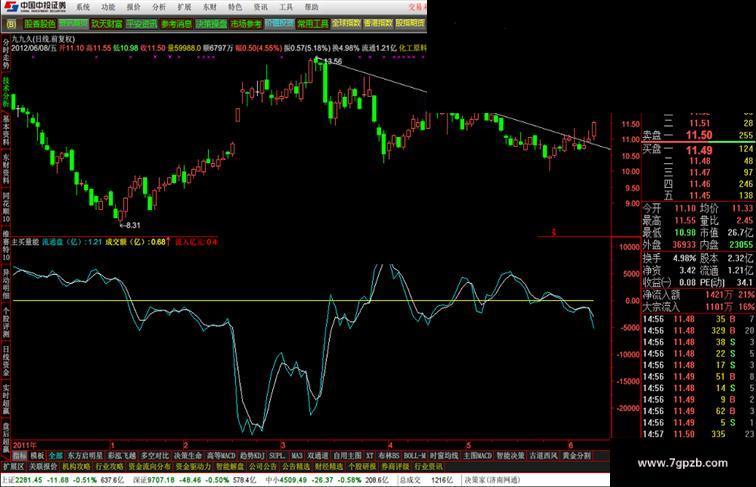 当满足条件净流<1日前的净流AND净流>0时,在0和净流位置之间画柱状线,宽度为3,0不为0则画空心柱.,COLOR00BBBB