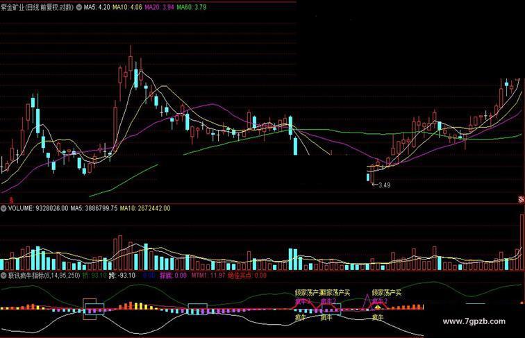 {DRAWTEXT(CROSS(绝佳买点,2.40000) ,-55,'疯牛1'),COLORFFFFCC,LINETHICK3 ; };